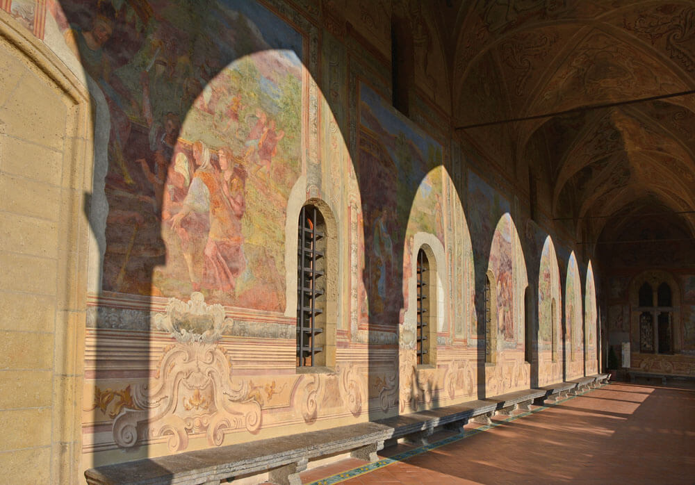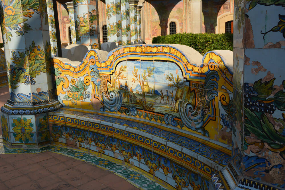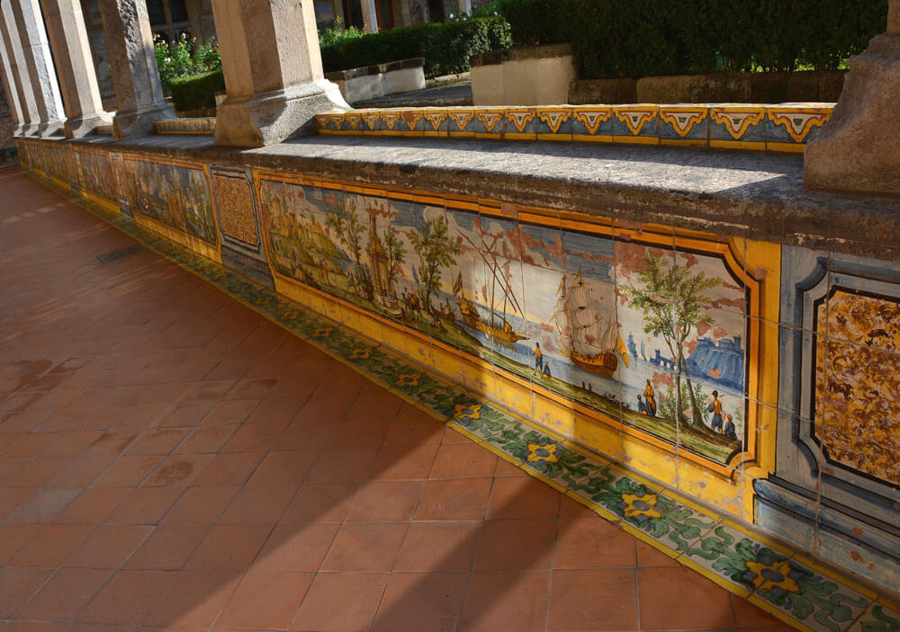 The monastery courtyard deserves special mention, but before that, let’s walk through the Cloister Gallery, made using the majolica technique. The plinth of the arches is covered with ceramic panels depicting romantic landscapes.
