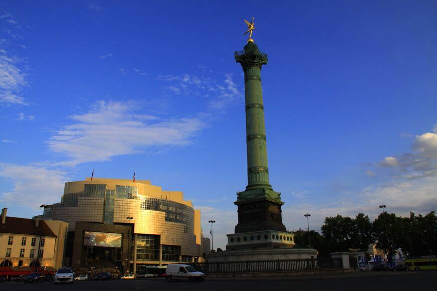 There is another opera in Paris - on the Place de la Bastille, where the Bastille castle used to stand, which was stormed by the population during the French Revolution. The Bastille Opera House was built in the 1980s. There is also the "July Column" - in memory of the July Revolution of 1830.