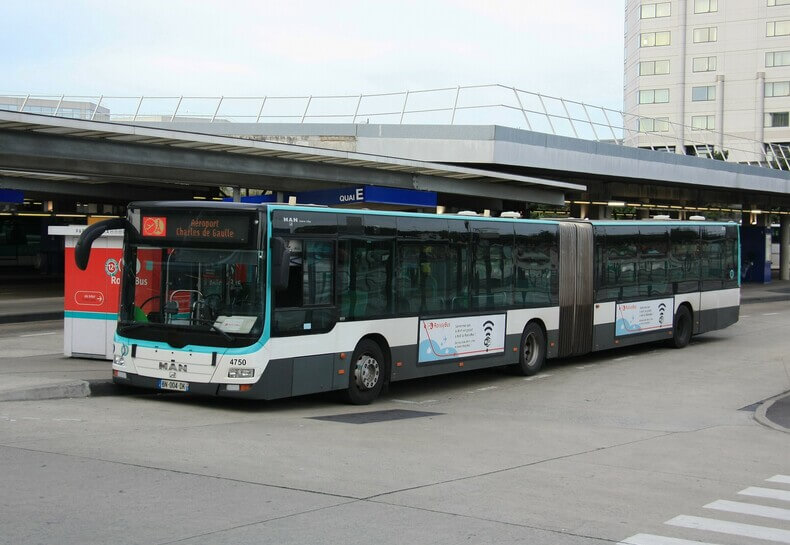Connects Charles de Gaulle Airport and Nation stations (metro lines 1, 2, 6, 9) and departs every 15-30 minutes. Travel time is 80 minutes. Departure time to the airport: 05:35-20:20, from the airport: 07:00-09:37. Tickets can be purchased from machines located at metro, RER and other stations. The ticket costs 2.15 euros, or 2.50 euros from the driver.