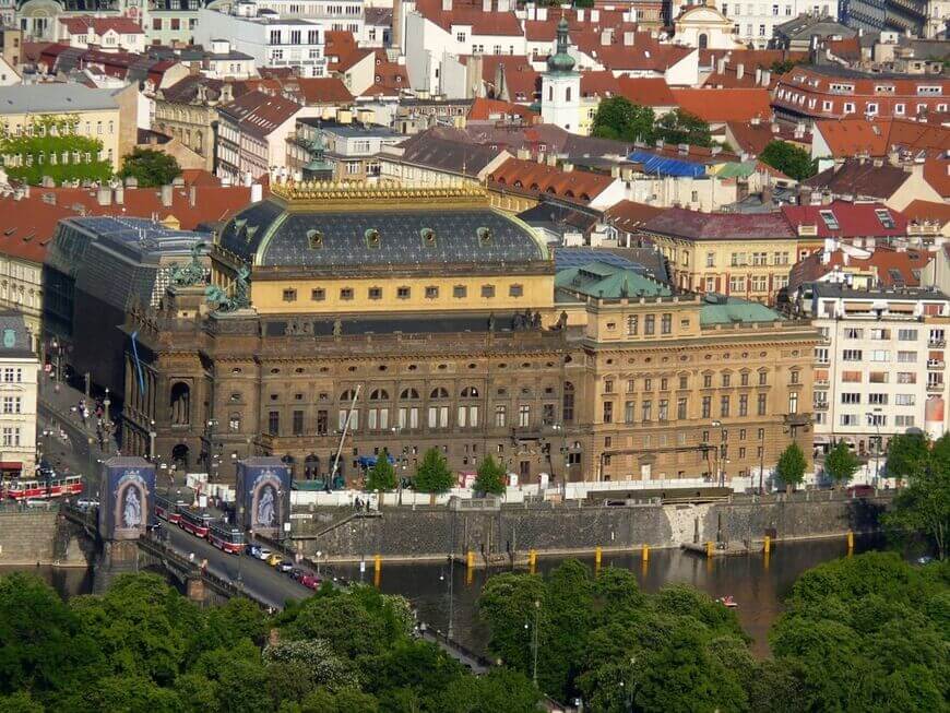 Continue along Masaryk Beach and enjoy the modern Art Nouveau buildings, see the Šitkovská Water Pump Room, a branch of the Goethe Institute and the National Theatre: