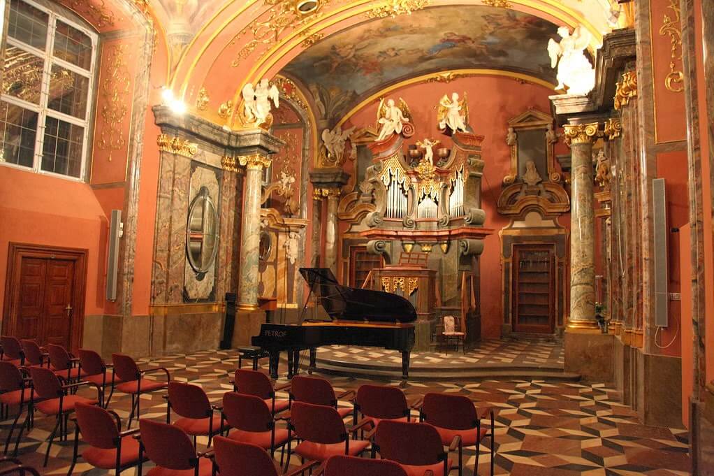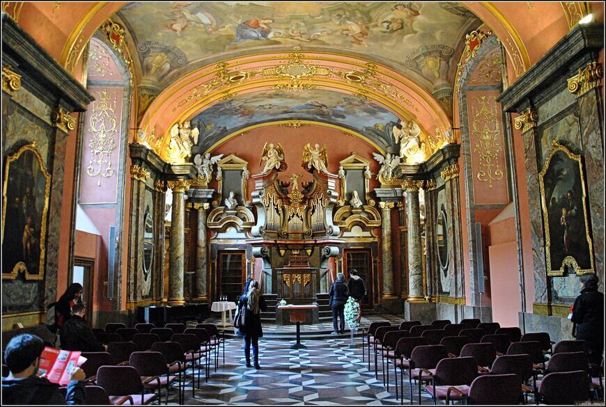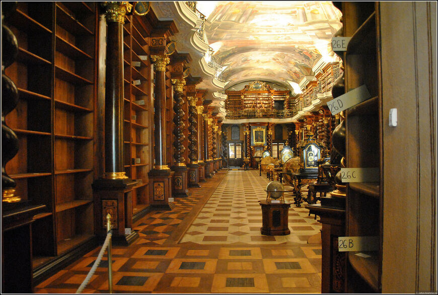 The complex also includes the Mirror Chapel, the Mathematical Museum, the Astronomical Observatory, the University Library, and the Meteorological Station. There is an observation deck on the astronomical tower, at a height of 68 meters. This is what the Clementinum looks like from the inside: