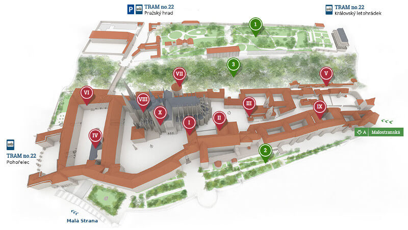 Let me explain the designations: I - Royal Palace, II - History of Prague Castle, III - Basilica of St. George, IV - Treasury, V - Zlata Ulichka, VI - Picture Gallery, VII - Powder Tower, VIII - St. Vitus Cathedral, IX - Rosenberg Palace, X - St. Vitus South Tower, 1 - Royal Garden, 2 - Southern Gardens, 3 - Deer Moat.