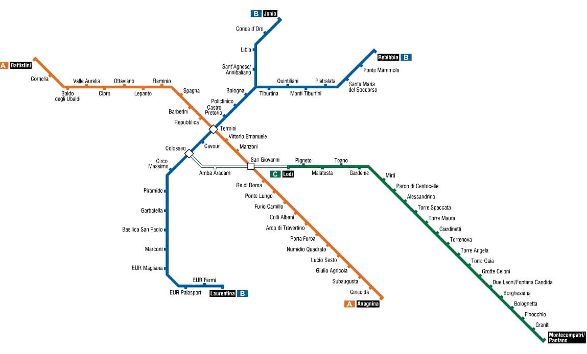 - Blue Line B: Laurentina - Rebibbia; popular stops: Colosseo (Colosseum and Roman Forum);