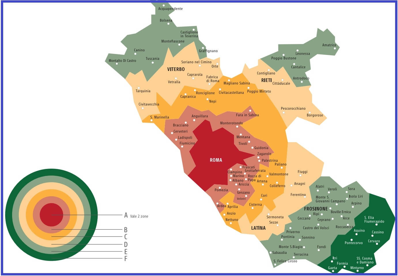 There are 7 tariff zones in the Rome transport system, but since Rome itself (within the city) includes two zones, the transport zones of Rome are the following: A, B, C, D, E, F. Rome's Fiumicino and Ciampino airports are located in zone B. Here's how these zones look on the map: