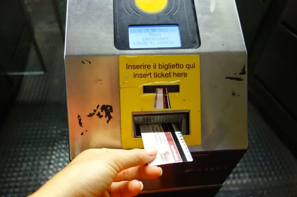 Train tickets can be purchased at the station, from machines or online. Before boarding the train, you must stamp your ticket in the yellow-orange machines located at the beginning of each platform.