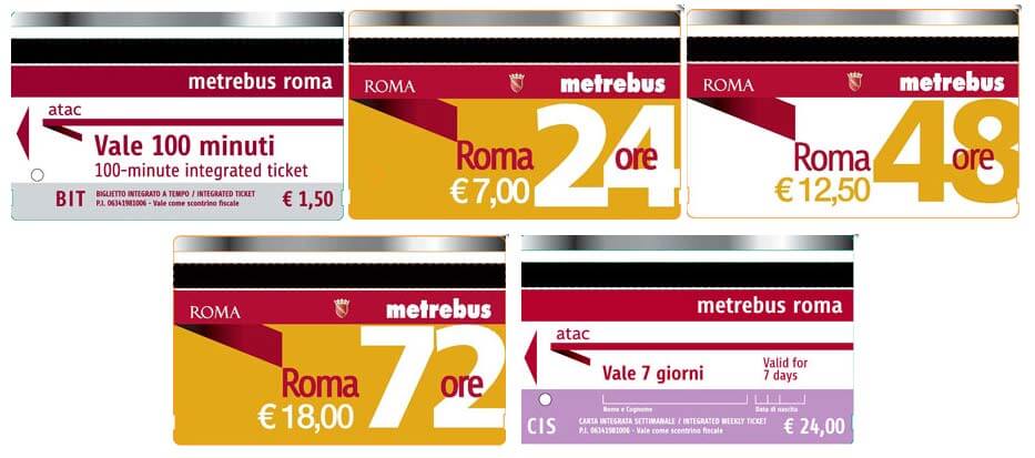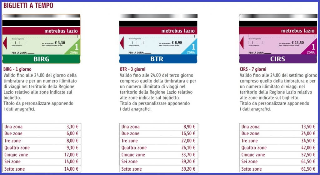 For trips in the tariff zones - the suburbs of Rome and the Lazio region - one-day - BIRG, three-day - BTR, seven-day - CIRS tickets are valid.