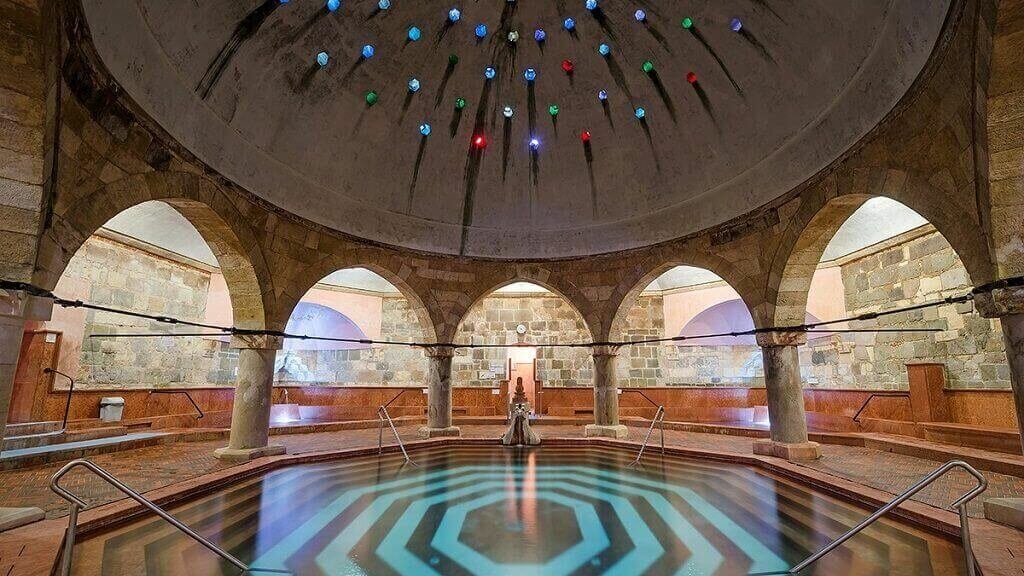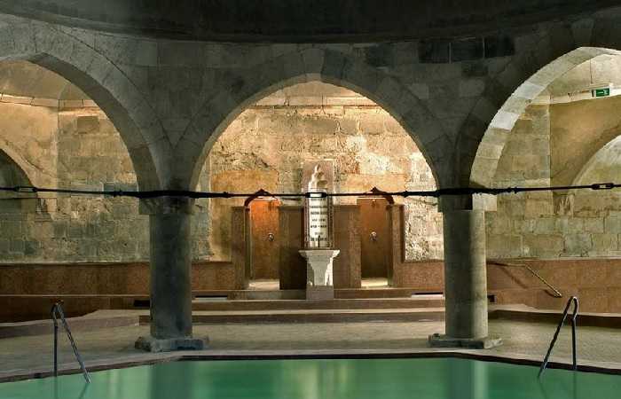 The Rudas Bath has a domed roof with holes. Below it, in the middle, there is one large pool, and in the corners there are 4 small pools. They have different temperatures from 28 degrees to 42 degrees.