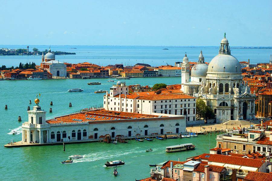 Construction of the church began in 1630 and was completed in 1681. The architect did not live to see this moment. The basilica was consecrated in honor of St. Mary, who saved the Venetians from the Black Death. (“Salute” means healing.) The building stands on hundreds of thousands of powerful wooden beams built into the bottom of the Grand Canal. This was an expensive, labor-intensive and lengthy process, as the land subsided, but for construction it was necessary to obtain a monolithic site. A brick octagonal basilica was built on a foundation covered on the outside with marble pellets. The central dome with fifteen ribs, having a hemispherical shape, stands on an 8-sided drum with large windows and external arches. At the top of the altar there is another small dome of the same shape. The exterior and interior of the church are made in Baroque style. The facade is richly decorated with columns, bas-reliefs, sculptural compositions and pilasters. The unusual shape of the central entrance was associated with a triumphal arch erected in honor of the victory over the epidemic. Above the pediment is a statue of the Virgin Mary with the baby Jesus, John the Baptist and the Archangel Michael. On the cornices there are figures of kings and prophets of the Old Testament.