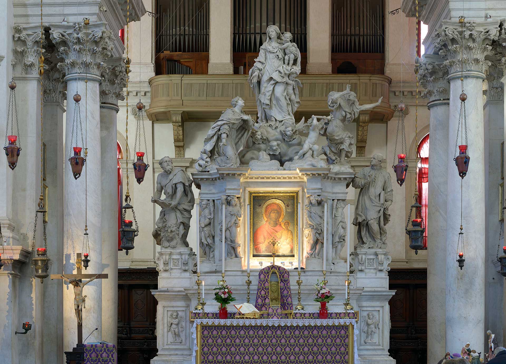 Above her is again a statue of the Virgin Mary with the newborn Jesus in her arms, on the left a Venetian woman kneels and begs the Virgin Mary to help her, on the right an angel drives out the plague from Venice. This composition was created by Justo Lecourt in 1674.