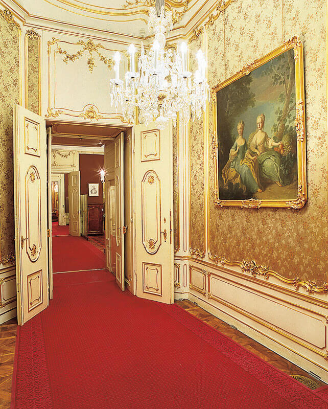 Here in this room you will see a portrait of Maria Theresa. She was the daughter of Emperor CharlesVI and was born in 1717. At nineteen she married Francis Stephen of Lorraine and gave birth to 11 girls and 5 boys. There are portraits of some of his daughters hanging in the room.