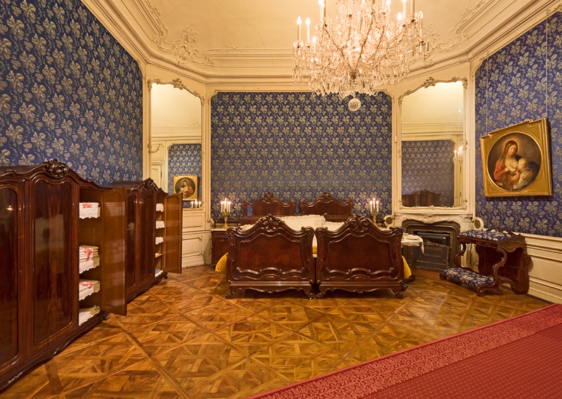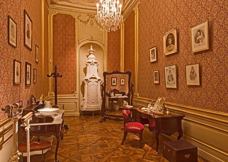 Now let's look at the husband and wife's bedroom. The walls are covered with blue and white silk. This room was used by the emperor and his wife only in the first years of their marriage. Since Elizabeth loved to travel, the emperor often had to be alone, although he always loved the beautiful Sissi.