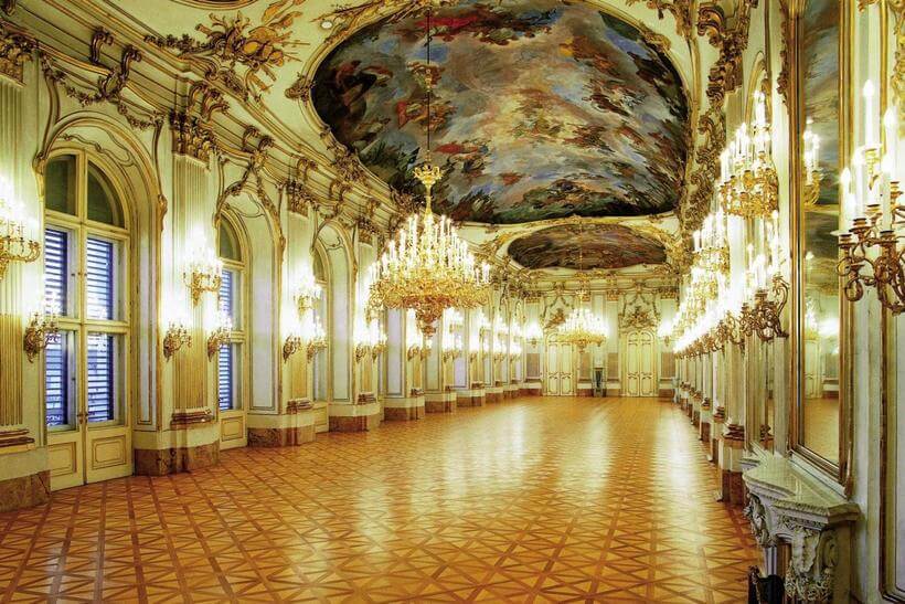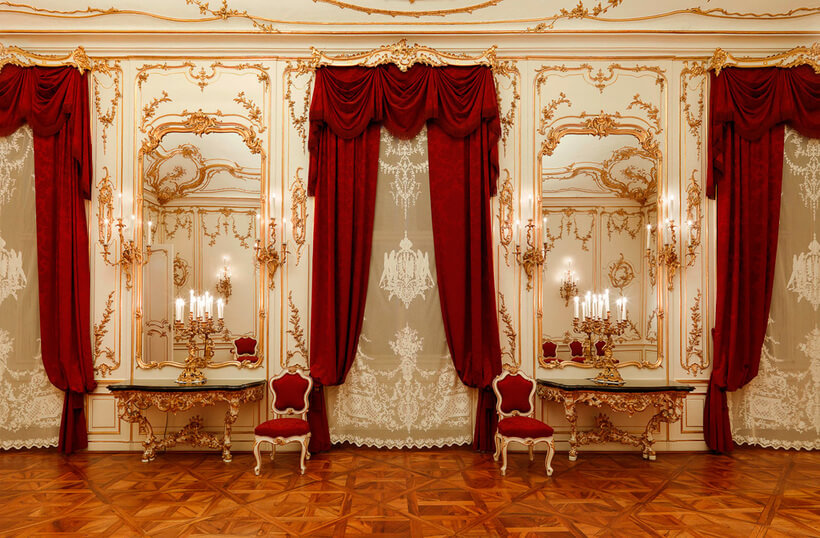 The hall with mirrors is very impressive. An abundance of mirrors adds volume to the room. The gold and maroon colors give it a look that was so popular back in the day. Chinese vases and bronze clocks are noteworthy. It should be noted that 6-year-old Mozart played here, ministers took the oath of office here, parties were held here.