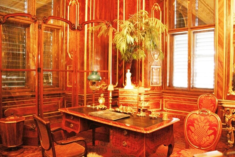 Let's take a look into the salon of the emperor's wife. Bright room decorated in neo-Rococo style. Please note that the clock stands next to the mirror with its dial upside down, and to find out the time you had to look in the mirror.