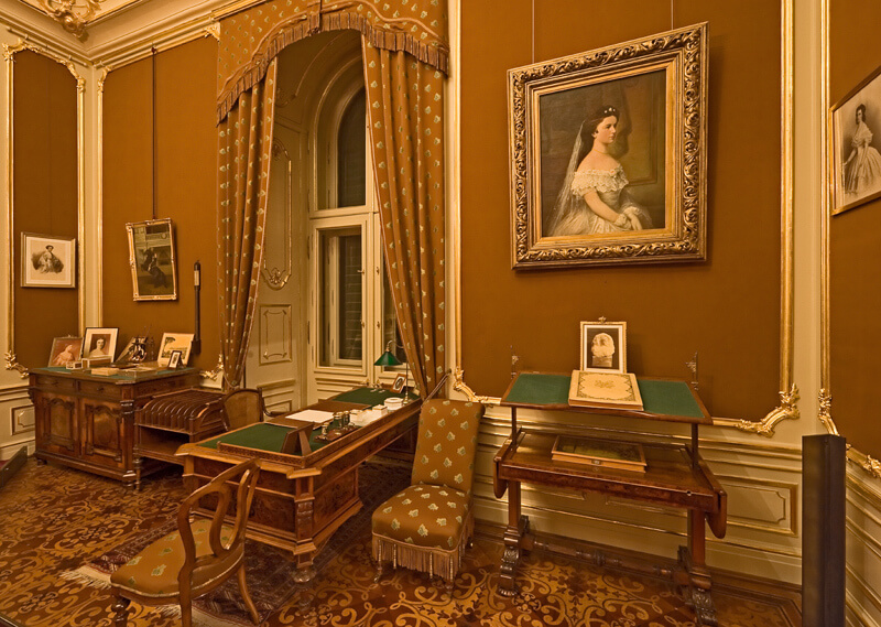 This is what Franz Joseph's office looked like. Don't you think it's a little simple compared to the previous rooms? Portraits of him and his wife Elizabeth hang on the walls.