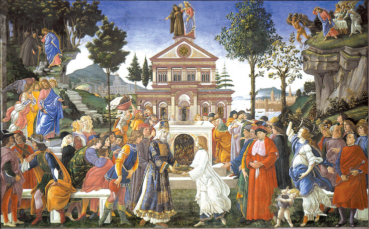 In 1481–1483, artists invited from Florence — Botticelli, Ghirlandaio, Rosselli, Perugino — and their assistants painted the side walls of the Sistine Chapel. There were 16 frescoes in total, 12 of which have survived. Six are related to Jesus Christ, six to the life of Moses.