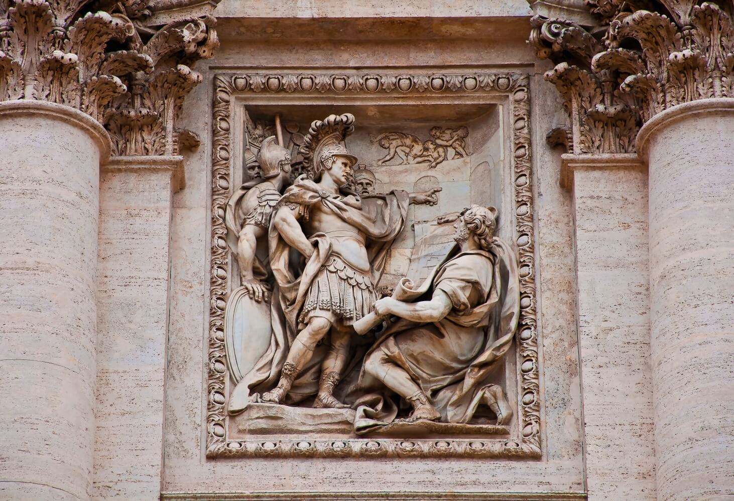 Above them are two bas-reliefs. On the left is Marcus Agrippa, who built the Aqua Virgo aqueduct: