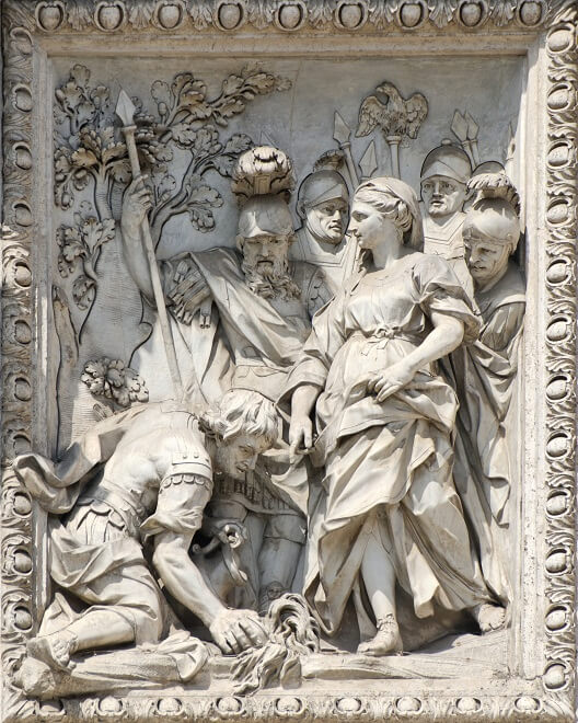 The right bas-relief depicts the moment when the Virgin points the Roman soldiers to the spring.