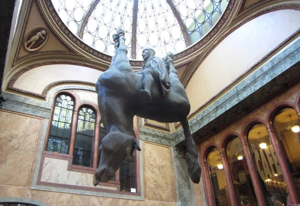Saint Wenceslas sitting on a dead horse. The statue is located in the Lucerna Passage.