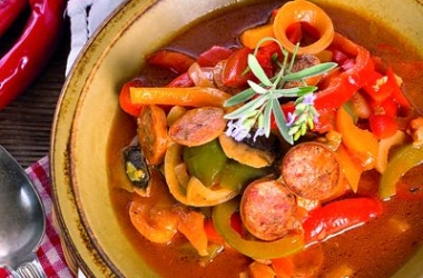 The next dish is lecho. It is prepared from onions, tomatoes, paprika and semi-smoked pork sausage.
