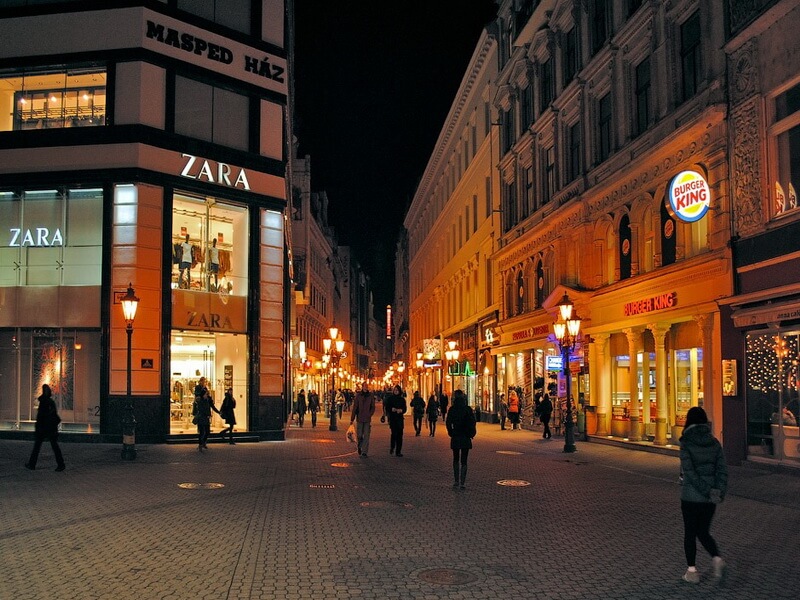 Váci Street starts from Vörösmart Square and continues almost to the central market, to Fevam Square. Its northern part is distinguished by an abundance of shops and shopping centers, and the southern part is distinguished by restaurants and cafes.
