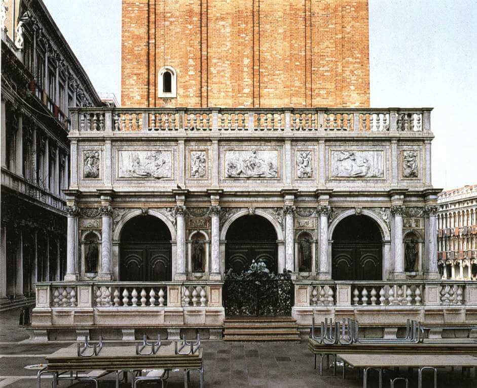 Next to the Bell Tower stands Loggetta - beautiful pink and white a marble building that looks like a classic triumphal arch. It was built in 1537-1547, and the terrace has only existed since 1663. The upper tier is decorated with bas-reliefs, and bronze statues are located at the portals. In Loggetta there is the ancient library of Sansovino.