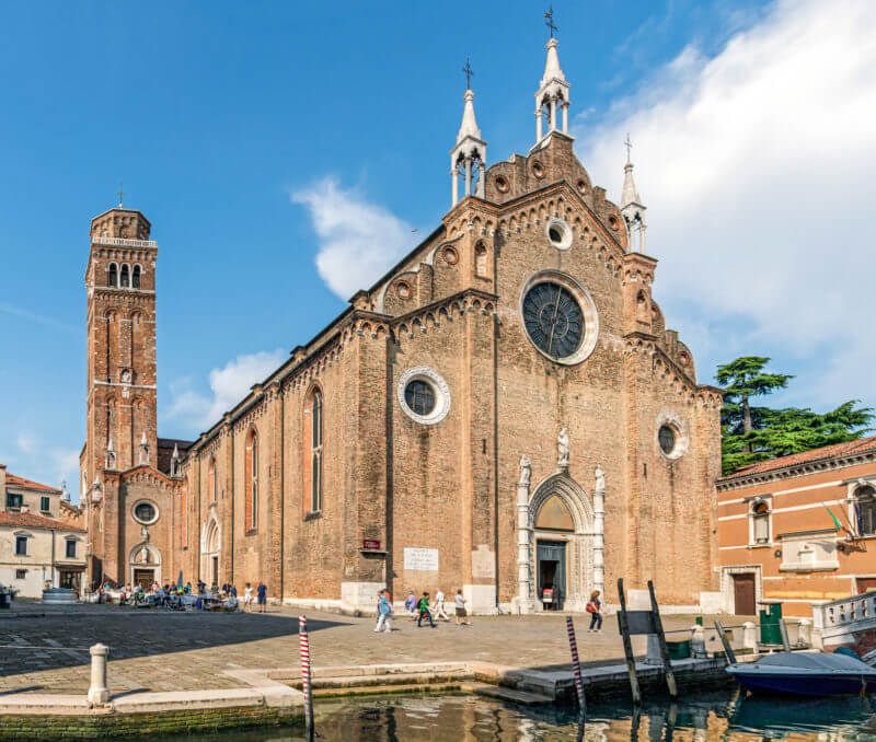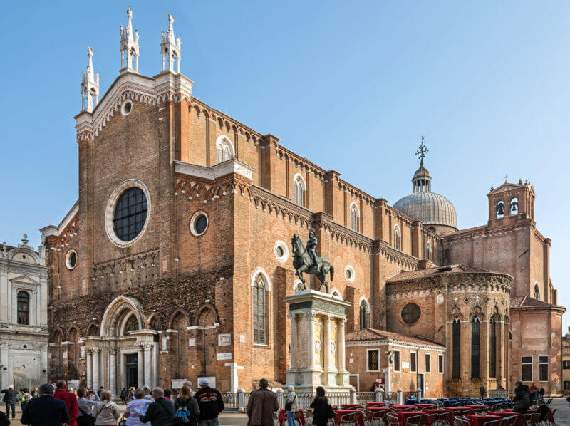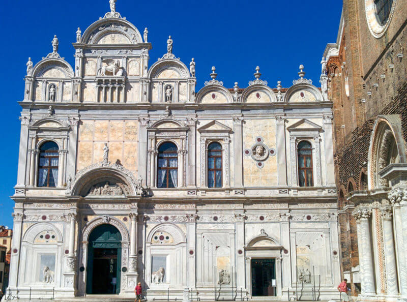 This is a classic example of Italian brick Gothic. In front of the church is a statue of the influential Doge Pietro Mocenigo. The church contains paintings by Bellini and Veronese. The central altar by Longhena is considered a masterpiece of Venetian applied art. On the square, next to the cathedral, the Scuola Grande di San Marco was built. It was built in 1260 by the Brotherhood of St. Mark.