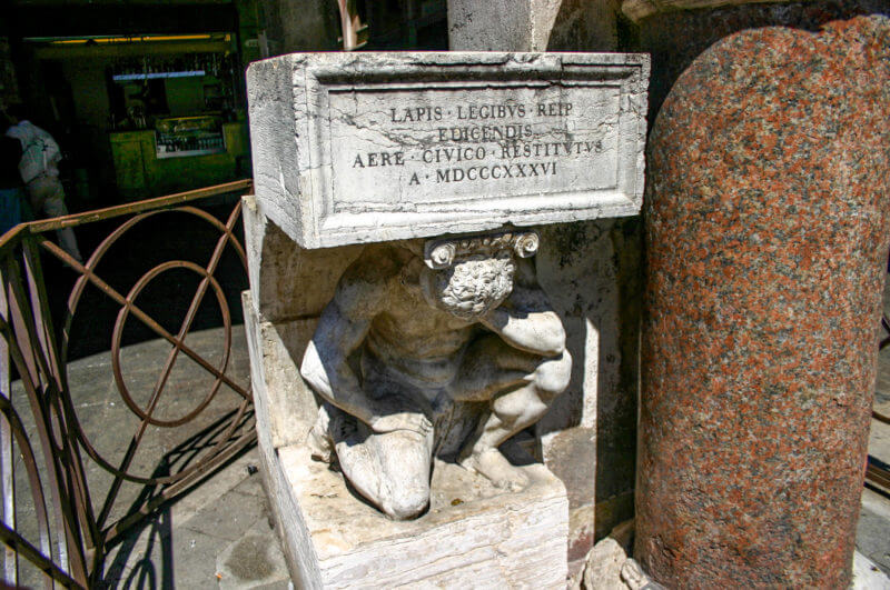 In front of the church there is a statue of "The Hunchback of Rialto" (Gobbo di Rialto). It was created in 1541 by Pietro da Salo. A kneeling man holds the pedestal from which government orders were announced. Here the Venetians left satirical “opposition” leaflets directed against the power of the Pope and the Doges.