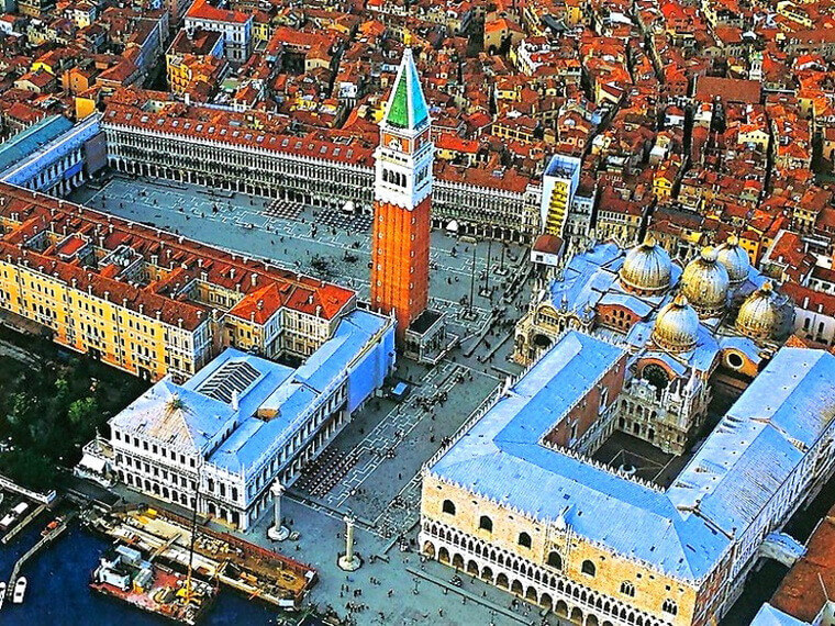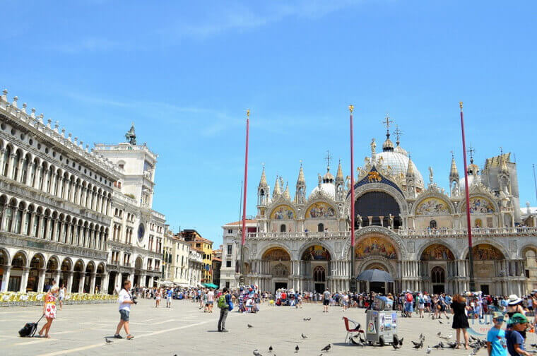 Piazza San Marco (St. Mark) is the central square of Venice. Together with the surrounding Piazzetta (from the Grand Canal to the Campanile) it forms the religious, administrative and tourist center of Venice. The length of the square is 175 meters, width is 82 meters. There are always a lot of tourists in the city square. Excursions around Venice often start from here. About 20 million people visit St. Mark's Square every year. Tourists here are greeted by many pigeons, which, according to legend, were once brought from Egypt as a gift to the Doge's wife.