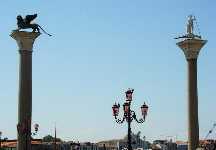 On the left is the column of St. Mark, on the right is St. Theodore. At the top of the left column is a bronze winged lion (probably created in Assyria in the 5th century BC).