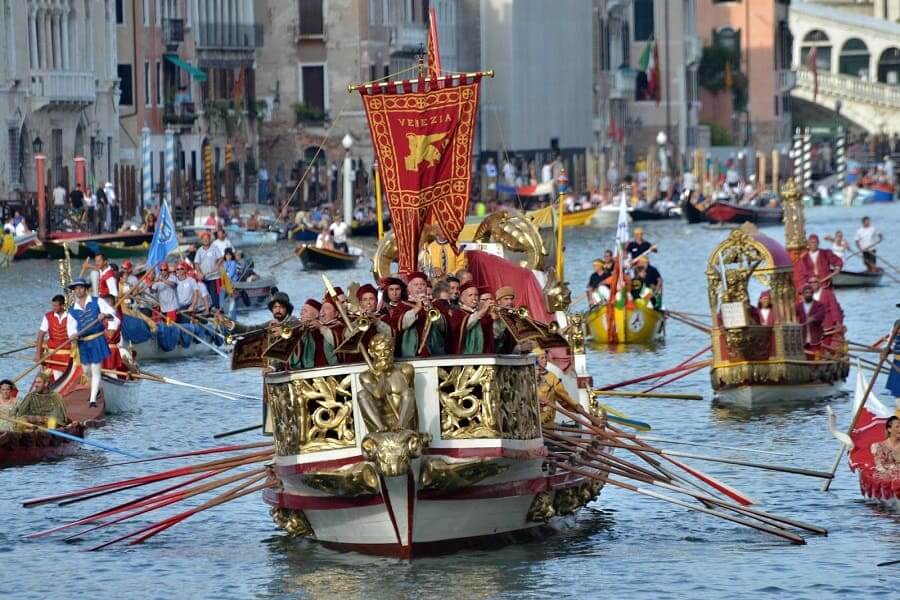 On the second opening day, Sunday, a beautiful event begins at 10:30. Variously decorated boats and gondolas, driven by boatmen dressed in colorful clothing, float along the “Grand Canal” from Punta della Dogana to Rio di Canaregio. Along the way, they are greeted by enthusiastic spectators, and after the event, guests are offered traditional Venetian cicchetti, delicacies and sweets.