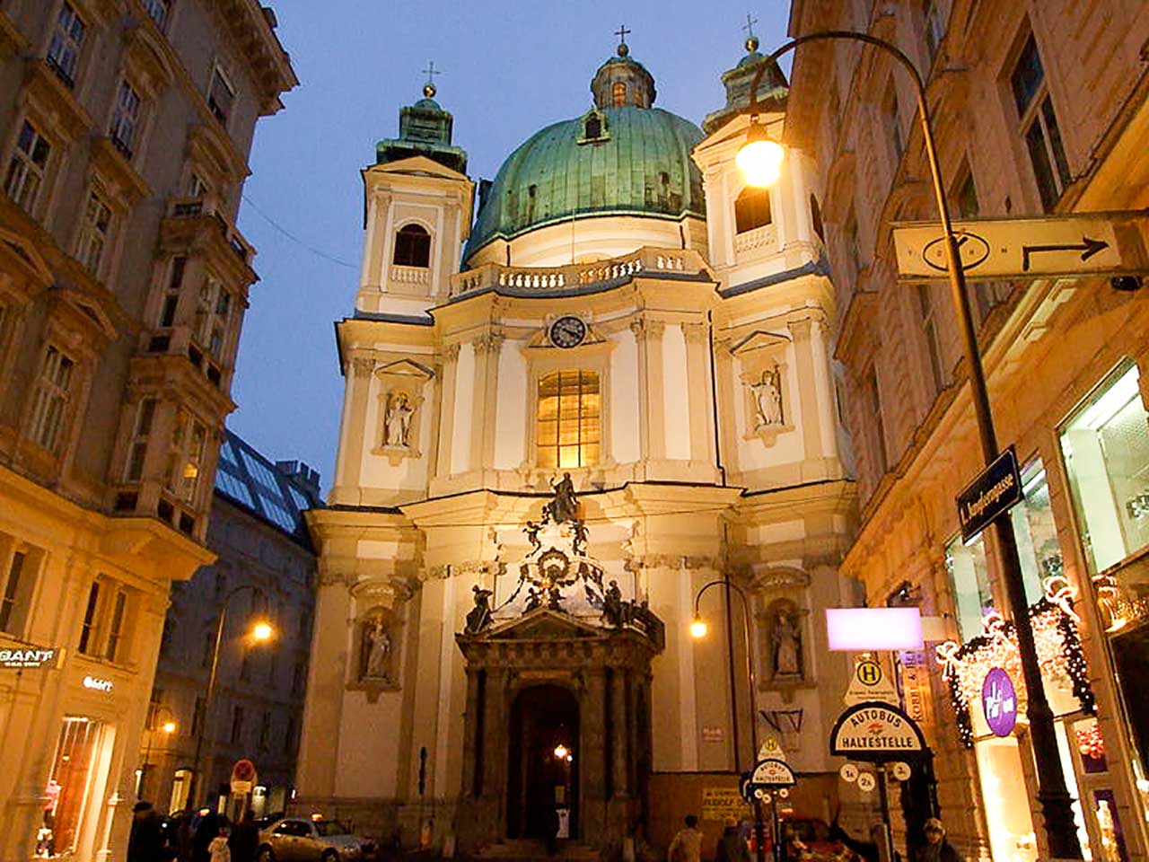 Peterskirche is located in the historical center of the city, next to the Graben street, on St. Peter's Square.