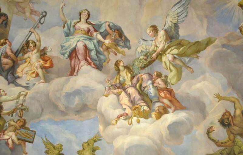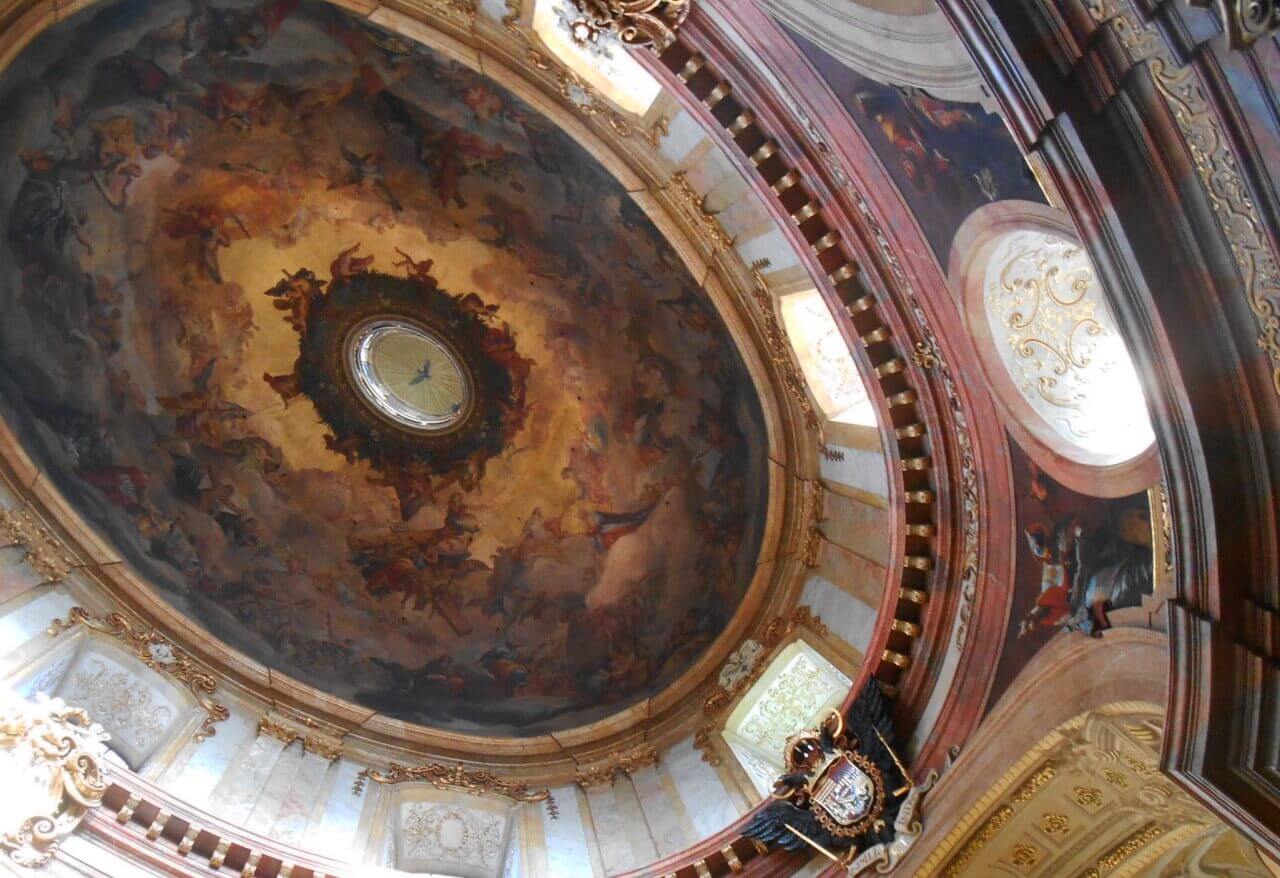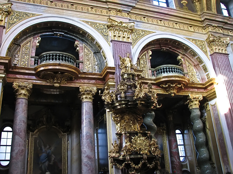 The inside of the church is as beautiful as the outside: the ceiling and walls are painted with unique frescoes. Next to each icon and fresco are the main features of the Baroque style - statues of cherubs and singing angels.