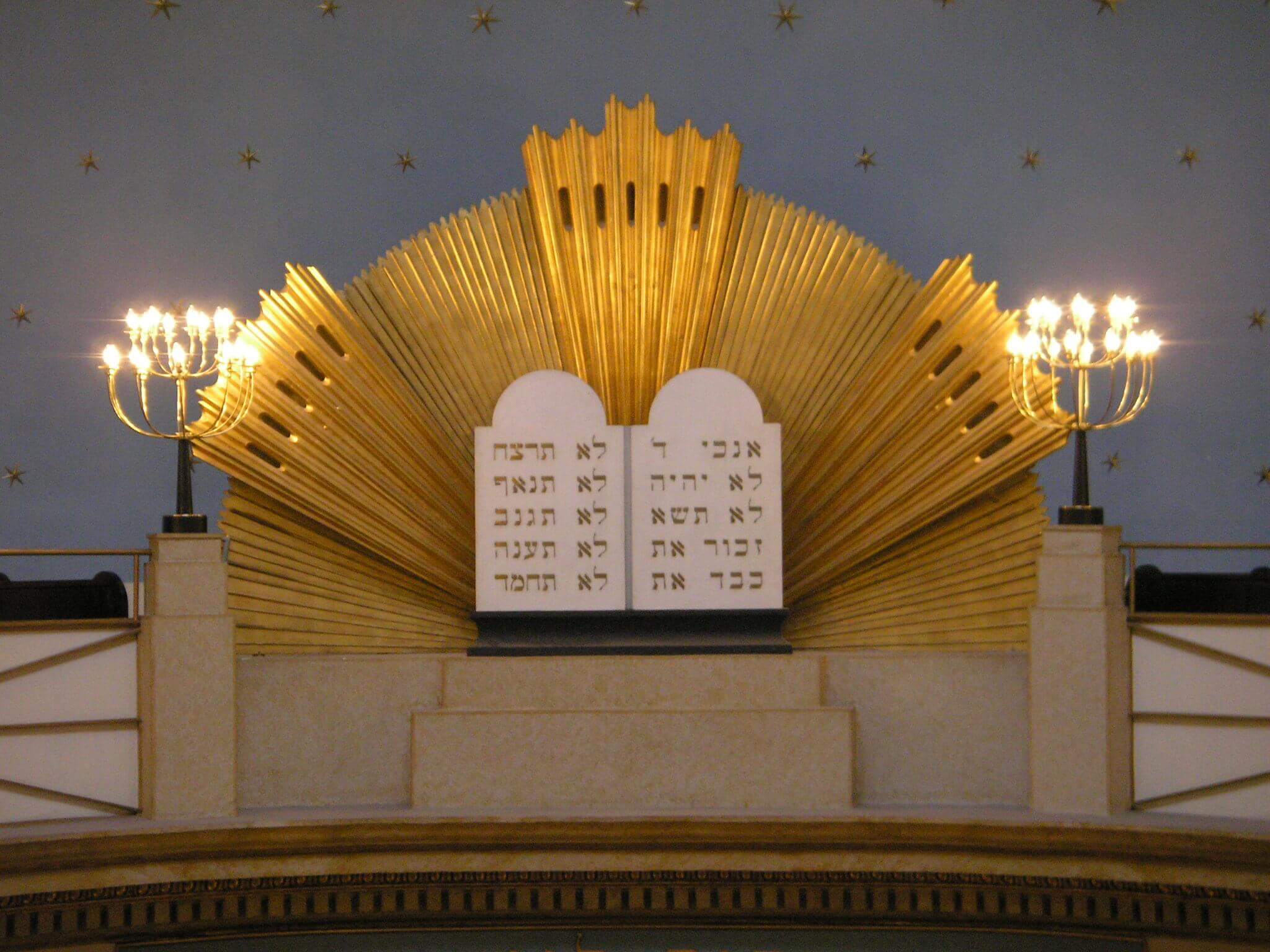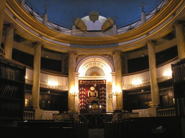 The interior is designed in the classic shape of a traditional synagogue. Here, under a narrow dome supported by columns, there is a gilded altar, the main pulpit and the commandments.