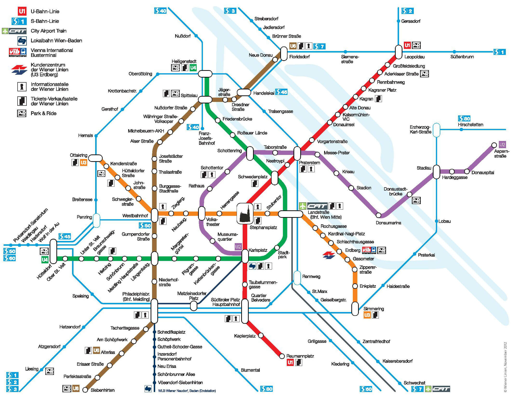Red line U1 stations: Stephansplatz (St. Stephen's Cathedral is located here), Karlsplatz (Vienna Opera House), Praterstern (Prater Park and Ferris Wheel), Haupbahnhop (Central railway station).
