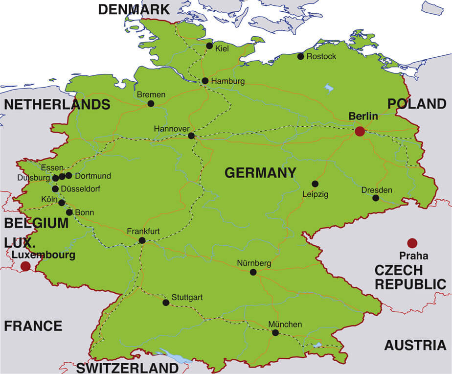 Largest cities: Berlin, Hamburg, Munich, Cologne, Frankfurt, Stuttgart, Dusseldorf, Leipzig, Dortmund, Dresden, Hanover, Nuremberg.